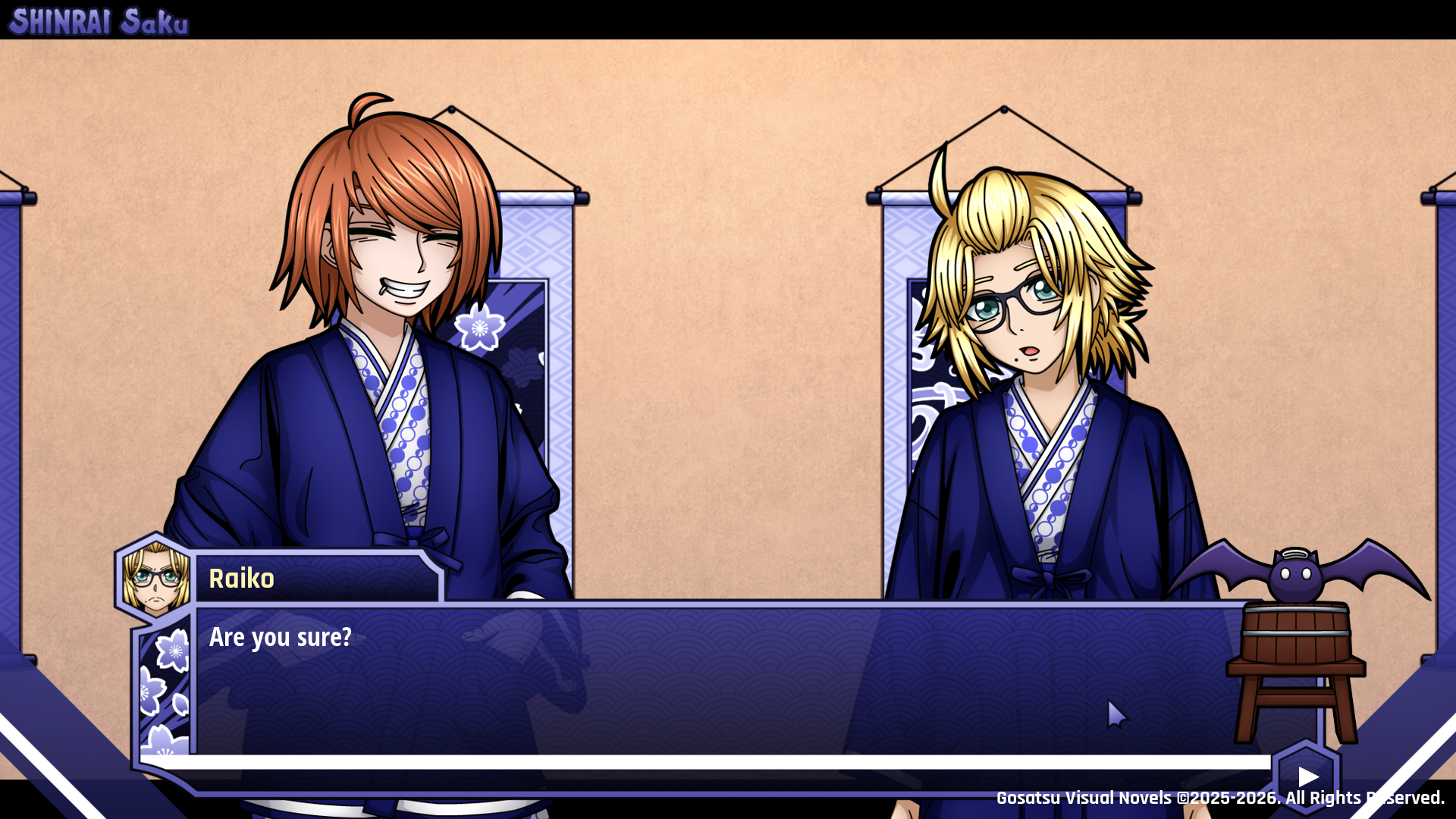 After finishing the more detailed staircase background for SHINRAI Saku (which 5$+ tier patrons can now check out here), I went on to quickly whip up some super simple ones, like the one you can see above, depicting only a wall with some hanging scrolls. These are intended for a few super short dialogue exchanges during which I couldn’t really re-use any of the other BGs and for which it wouldn’t have made sense to draw something extremely elaborate, when you’re only going to see it for, like, three minutes.
