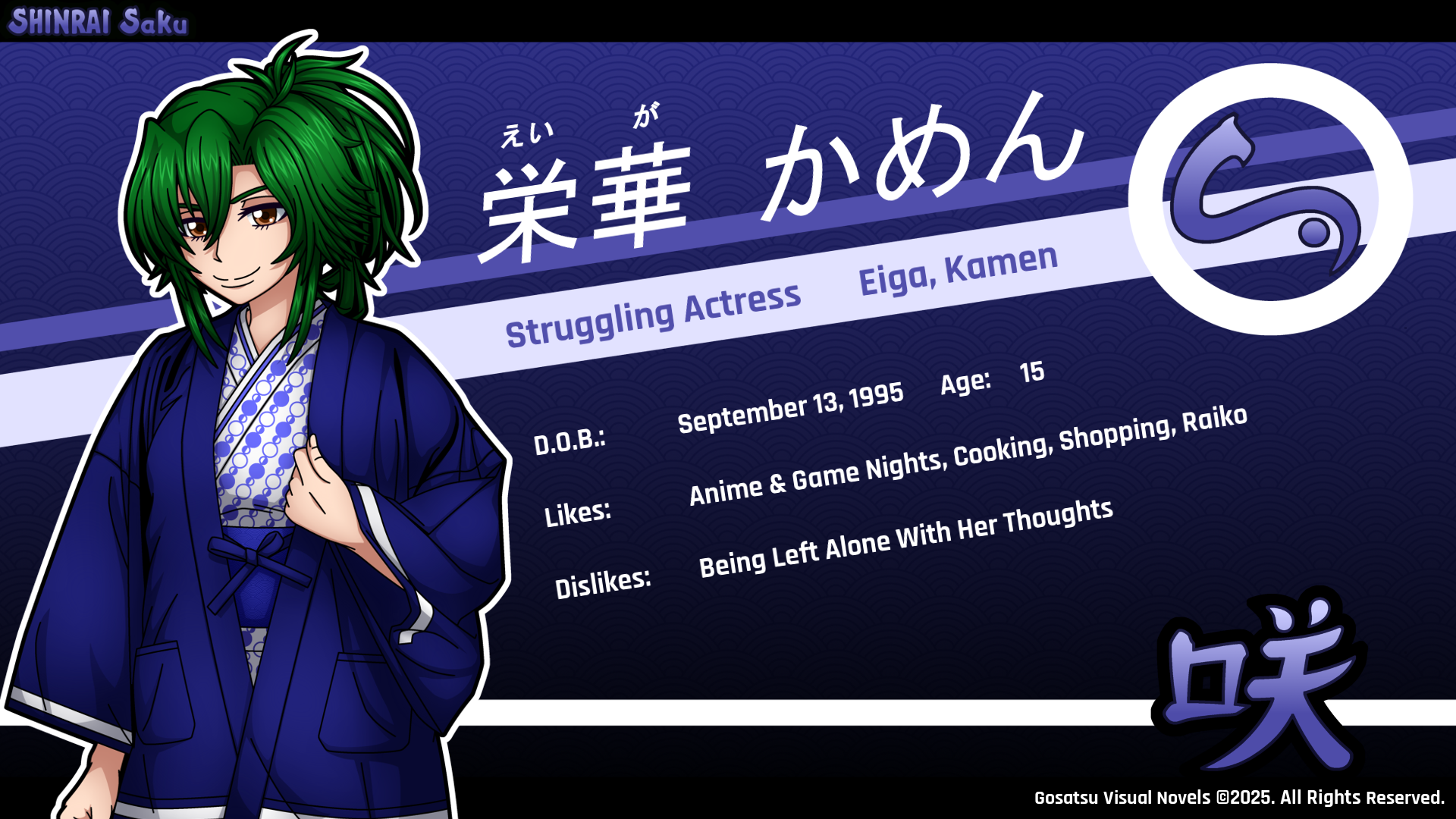 It’s been a while, but we’ve just updated the sub page for SHINRAI Saku – Blooming Beyond Despair with a new introduction card, this time of another returning member of the SHINRAI cast: Kamen Eiga!