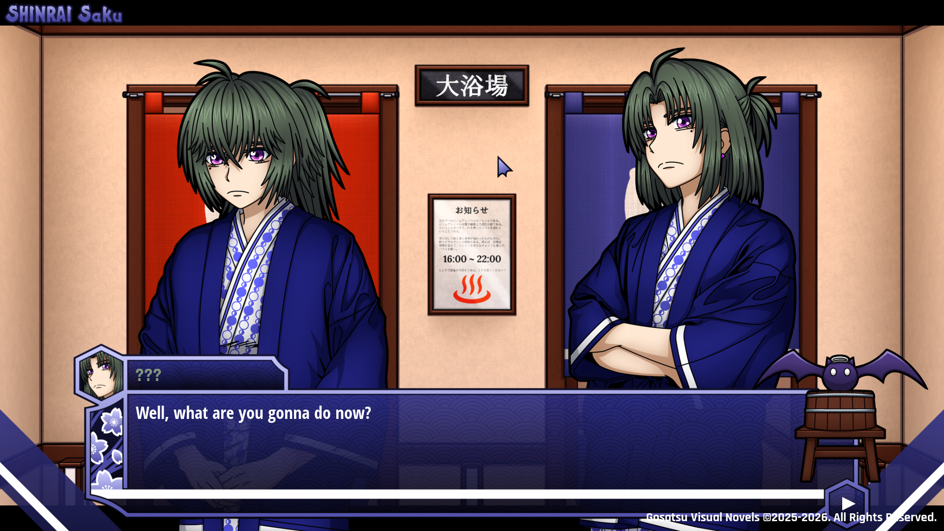 Fun fact: the sign in the center does not actually display any onsen-related rules or information as it should. Instead, I took the definition for the term “visual novel” from an old presentation I had to do in one of my Japanese classes and copy-pasted it into the frame as a little joke. And, of course, I couldn’t resist but add the sentence “By the way, I really love dinosaurs. Please watch JP!” at the end, haha.
